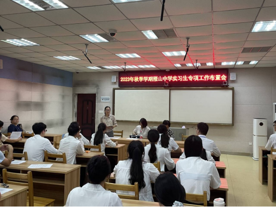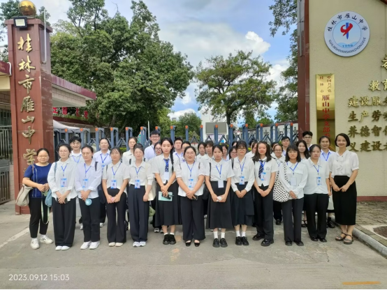 为促进师范生的培养,进一步巩固师范生教育知识与教学能力,人文学院2020级汉语言文学专业和英语专业共计32名实习生在刘渊老师和欧炼芬老师的带领下,于2023年9月12日前往桂林市雁山中学开展实习生师生见面会。