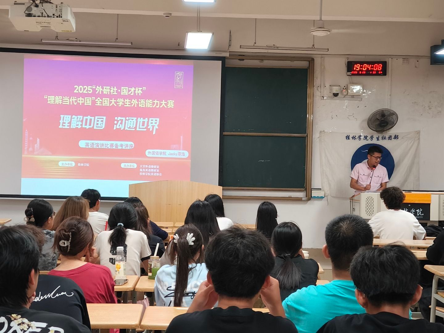 据悉,2025“外研社·国才杯”“理解当代中国”全国大学生外语能力大赛由广西教育厅主办,桂林学院首次承办这一汇集全区40多所高校的外语类高水平赛事。外国语学院高度重视,从上学期便启动赛事指导工作,本学期持续组织备赛辅导讲座及培训,助力我校学生在校级选拔赛中脱颖而出,为广西高校外语人才培养及国际传播能力提升注入力量。