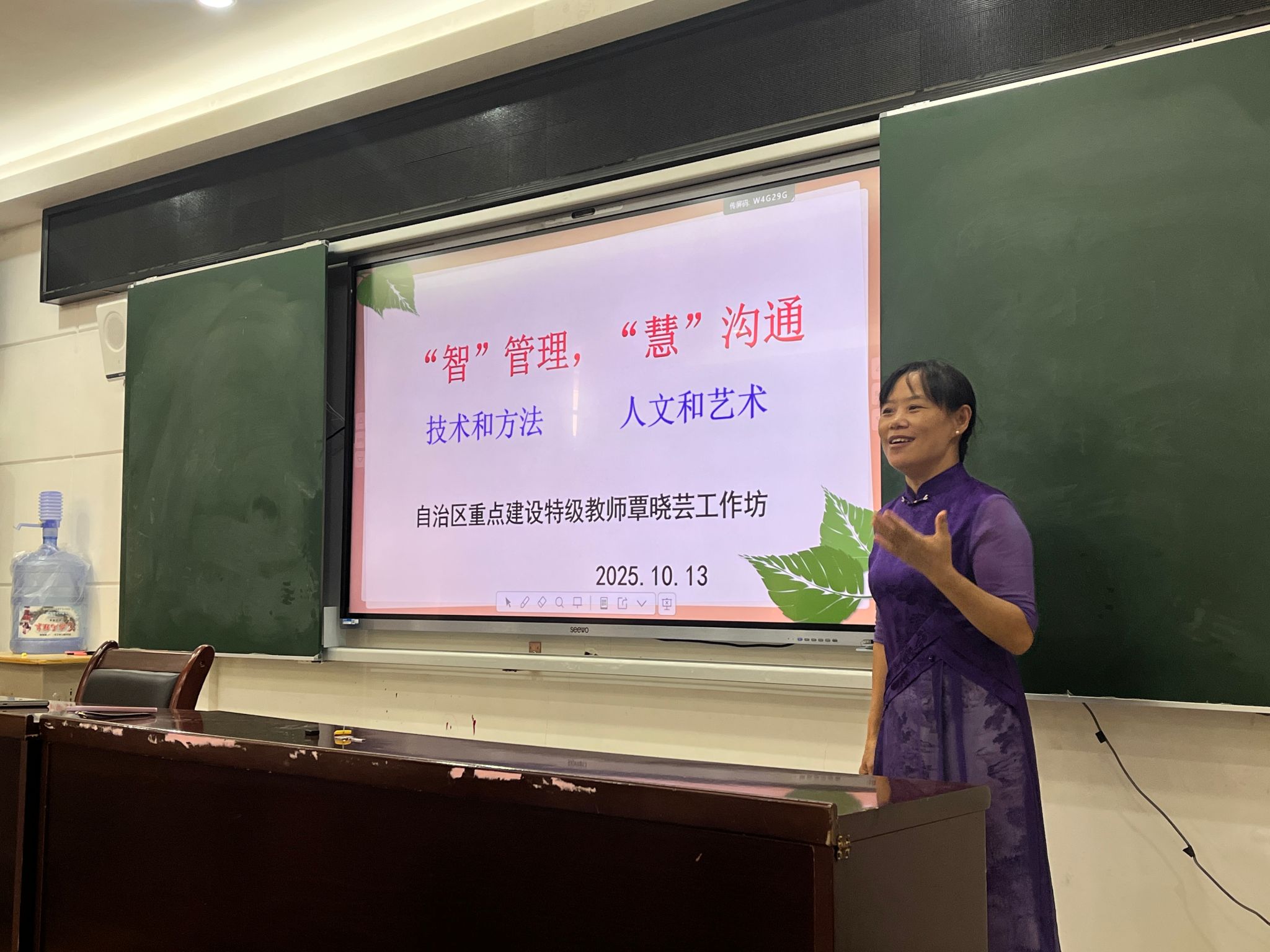 培训由该校自治区特级教师覃晓芸主讲,她以“智管理、慧处事”为题结合自身十余年班主任工作经历,系统阐述了班级管理的核心方法与策略,强调班级管理不仅是学生全面发展的重要途径,也是班主任专业能力的关键体现,并指出“班主任的每一项工作都应以促进学生成长为核心,在严管与厚爱中取得平衡”。