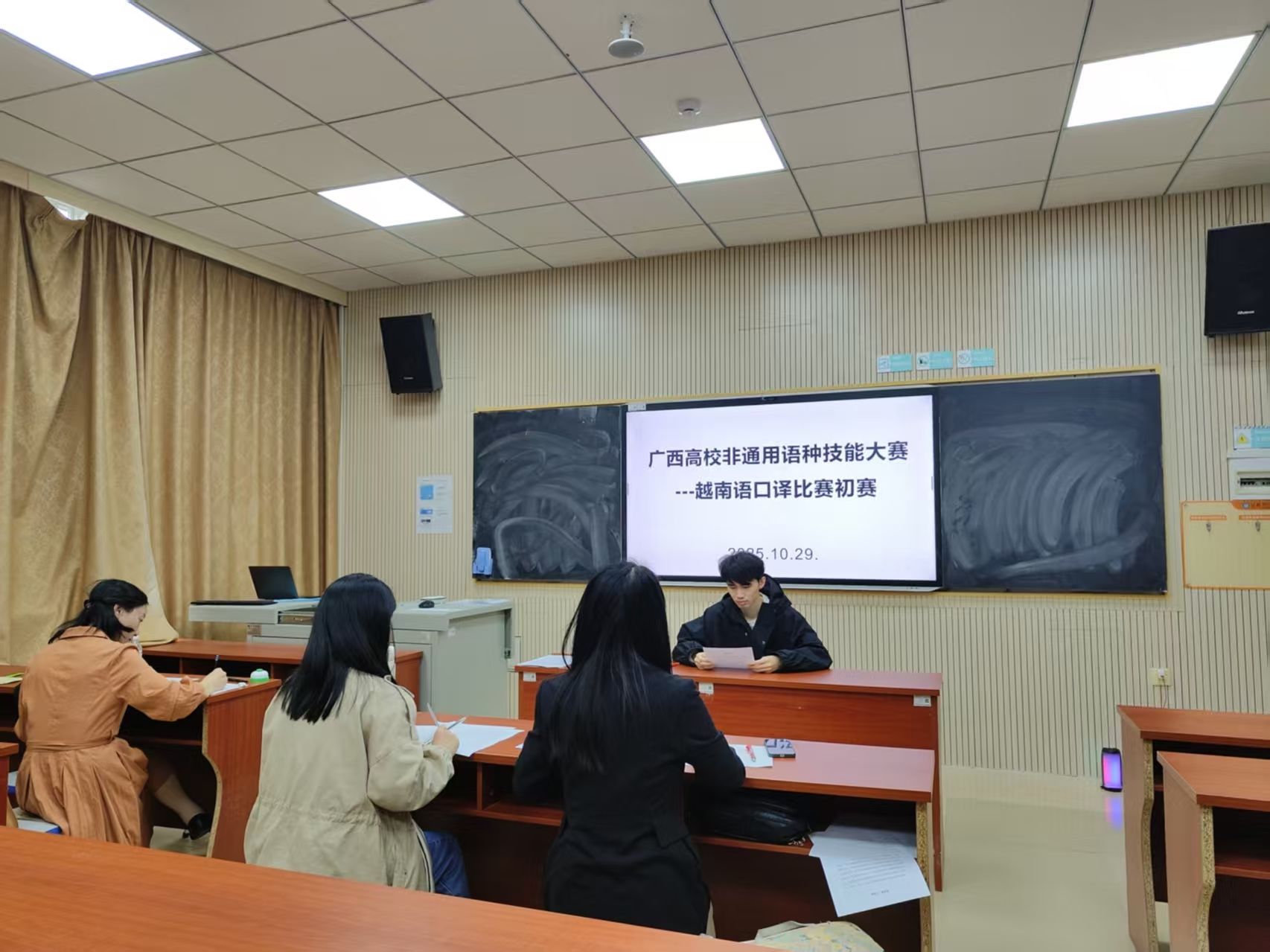 为深化非通用语种人才培养质量,推动跨文化交流实践,近日,作为学院“外语文化节”核心赛事之一的“广西高校非通用语种技能大赛——越南语口译比赛选拔赛”顺利落幕。本次赛事紧扣文化节主题,吸引全院越南语专业大四学子全员参与,赛场内选手专注投入、从容应答,既延续了文化节的热烈氛围,更彰显了非通用语种专业的教学实力。