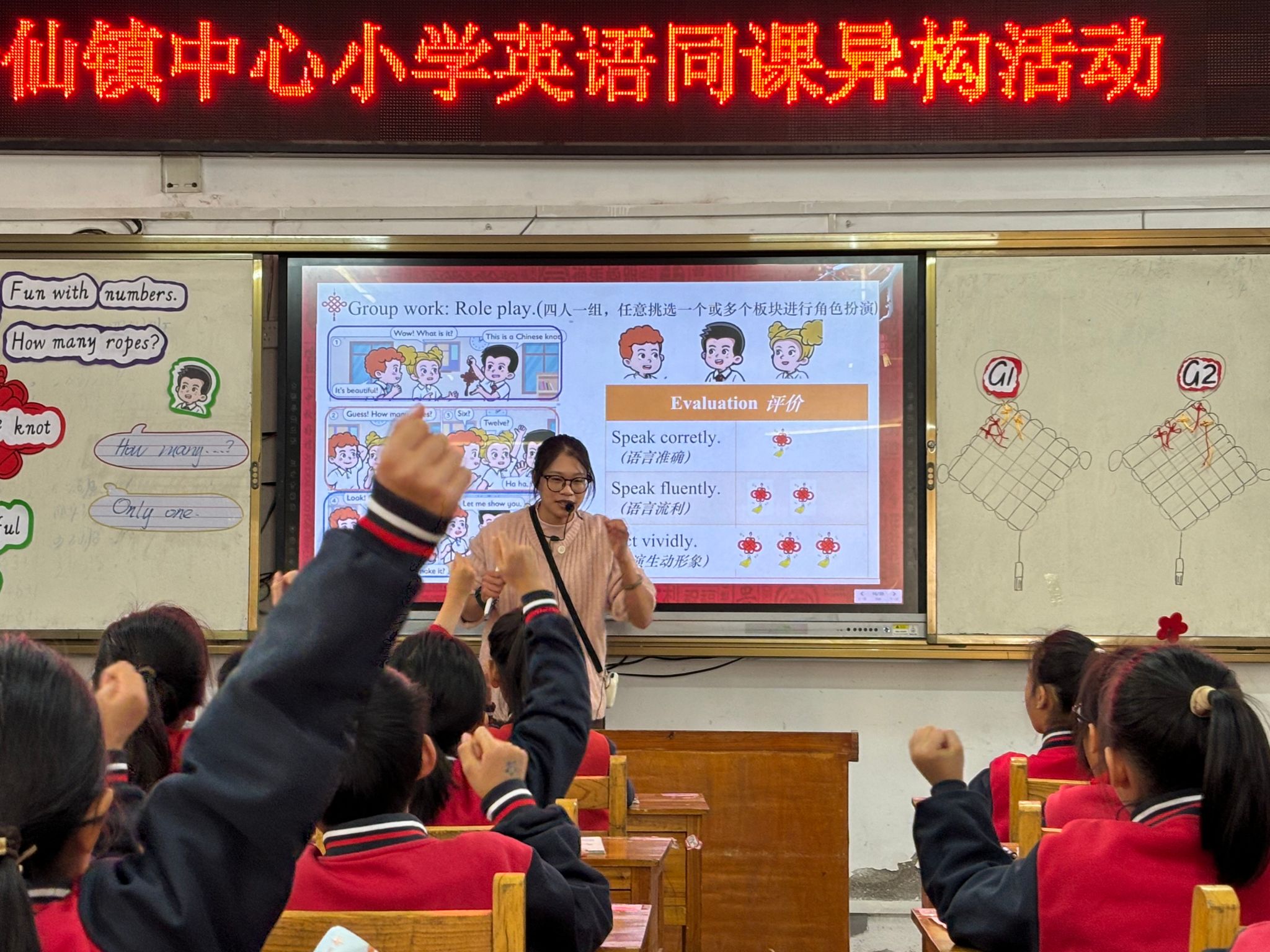 活动伊始,会仙镇中心小学潘颖颖老师率先登台授课。潘老师立足低年级学生认知特点,以“趣味数字”为核心,设计了层层递进的教学环节。课堂上,她通过“四人一组角色扮演”任务驱动学生参与,围绕“数字问答、绳结计数”等趣味场景引导学生互动,还明确了“语言准确、表达流利、演绎生动”的评价标准,让学生在沉浸式体验中夯实语言基础,课堂氛围活跃有序。
