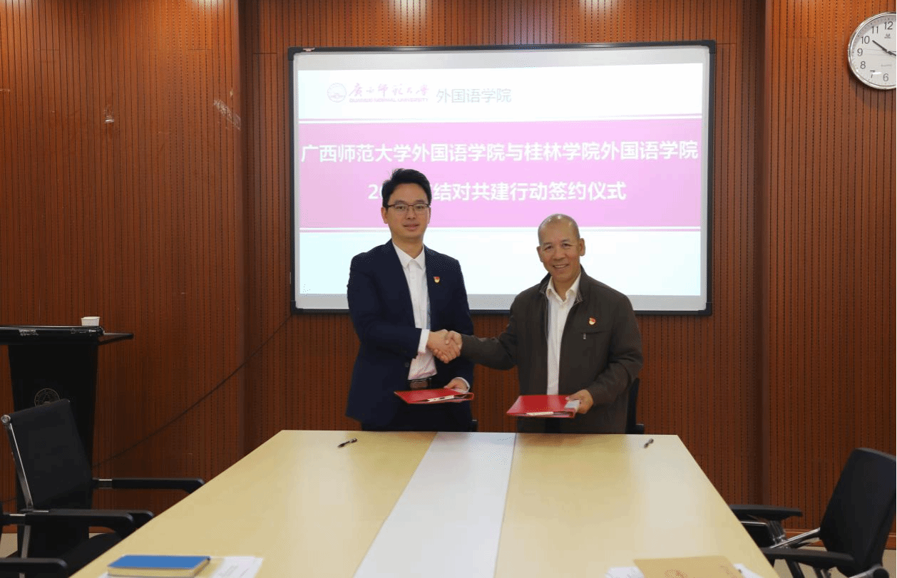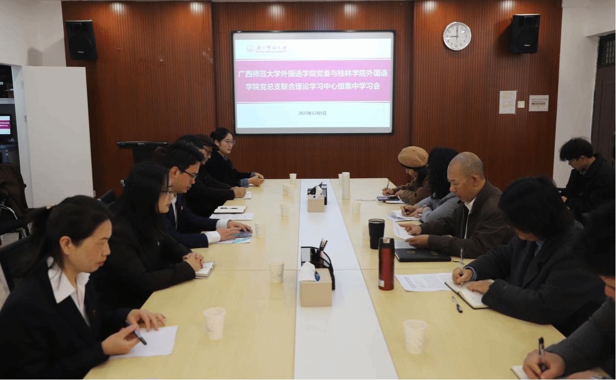 为贯彻落实《广西师范大学与桂林学院组织联建“五个一”行动方案》要求,切实以党建引领学院高质量发展,12月5日上午,外国语学院党总支与广西师范大学外国语学院党委在广西师范大学雁山校区起文楼231会议室联合开展理论学习中心组专题学习活动,并签订结对共建协议书。本次活动以“深学笃行党的二十届四中全会精神,高质量做好‘十五五’规划,以党建引领学院高质量发展”为主题,双方理论学习中心组成员及各党支部书记共20余人参会,会议由广西师范大学外国语学院党委书记江飞主持。