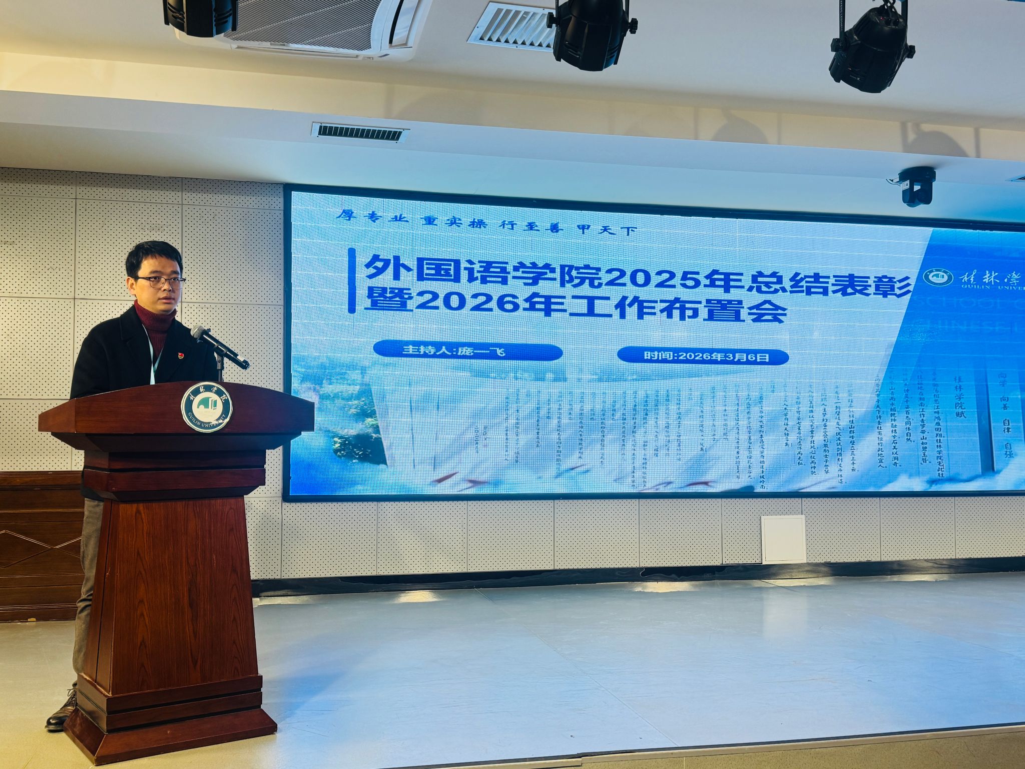 3月6日上午,外国语学院2025年总结表彰暨2026年工作布置会在至善讲堂顺利召开。会议全面复盘学院2025年评建攻坚工作成果,表彰先进集体与个人,系统部署2026年重点工作任务。学院党总支书记主持会议,全体教职工参会。
