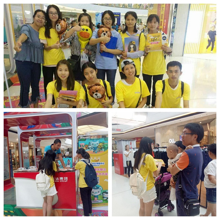 为凸显外语系应用型人才的培养导向,培养学生既有扎实的理论基础,又有工作岗位所需的综合职业能力的专业人才。我校外语系2015级商务英语专业的数10名学生在李一枝、周燕萍老师的指导和带领下,利用国庆长假在桂林市七星区万达宝贝王早教中心(以下简称为“早教中心”)参与市场调查和信息搜集等实践活动。