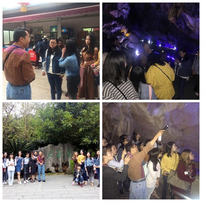 本次活动中,吕老师凭借自己精熟的泰语知识、高超的导游技能、多年导游生涯中积累的丰富经验,亲自为同学们示范如何在带团过程中灵活运用泰语进行车内讲解、景点讲解和商品导购。其中,大家对芦笛岩内美轮美奂、风格迥异的二十景的讲解实践最为印象深刻,受益匪浅。吕老师先让同学们按照各自准备的内容来讲解,然后逐一点评,最后再亲自示范。吕老师教导我们,一名优秀的泰语在为泰国友人介绍景点时,除了做到用词准确,通俗易懂,讲解有针对性、原则性、选择性和计划性外,还要做到言语风趣幽默、雅俗适中,不千篇一律人云亦云,更要着力打造自己的讲解特色,这样才能激发游客的好奇心,让游客触景生情,回味无穷,把游览活动视作一场难忘的视听盛宴。