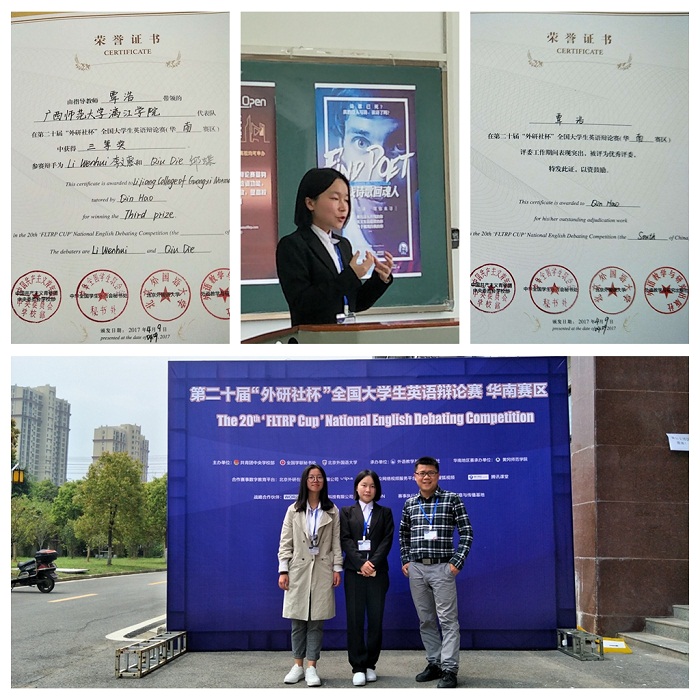 第二十届“外研社杯”全国大学生英语辩论赛(FLTRP Cup National English Debating Competition)华南赛区比赛于4月7日至9日在湖北黄冈师范学院隆重举行。我校英语辩论队2014级翻译专业李文惠、2015级汉语国际专业邱蝶两位同学代表我校参赛,最终荣获华南赛区三等奖。我校英语演讲辩论队指导老师覃浩老师受邀担任评委,获“优秀评委奖”(Outstanding Adjudication Award)及指导教师三等奖两项荣誉。