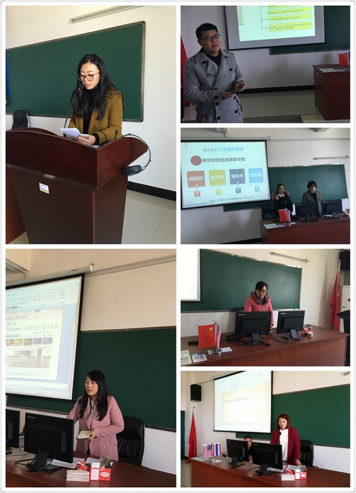起来”、“打造翻译专业特色课程”、“商务英语特色人才培养”、“越泰专业校内实践基地开发与利用”、“教师教育技能团队建设及多媒体课件创作”等主题向全体教师进行