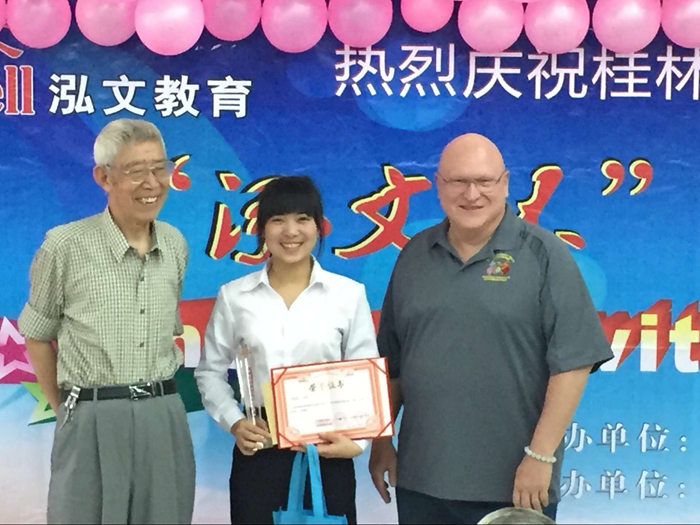 桂林市英语角理事会会长刘毓鲲和外教为覃菁菁颁奖