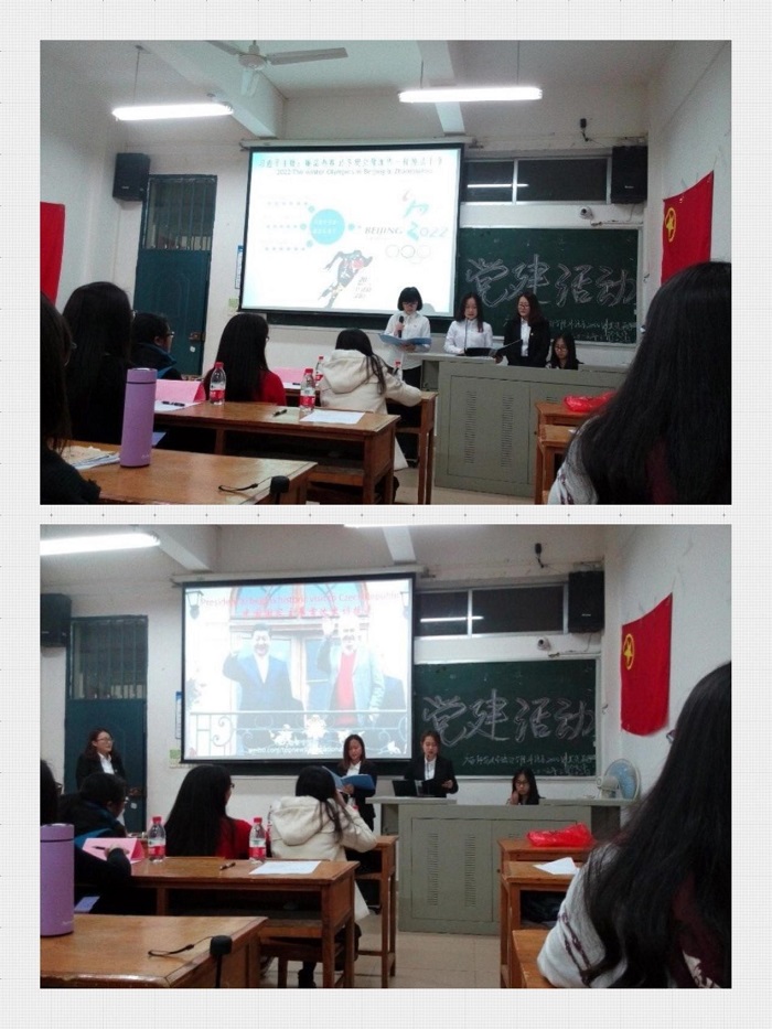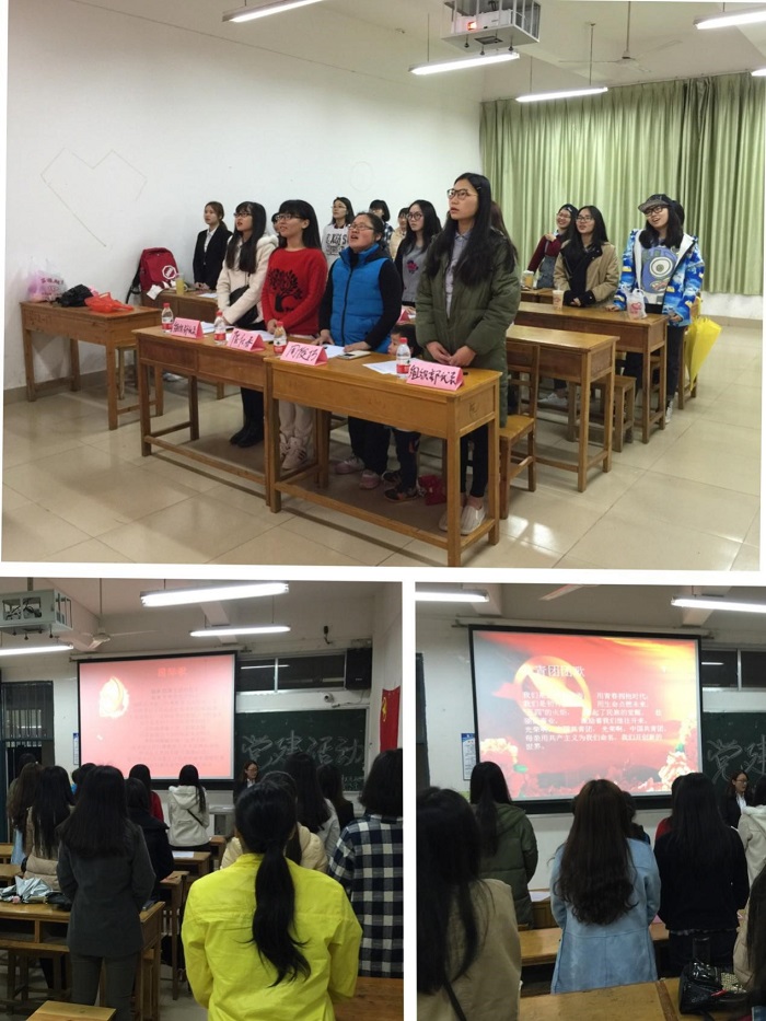 在全体团员共同努力、配合下,活动顺利召开,合唱国际歌、团歌,请年级辅导员致辞,简介活动目的和意义,通过时政要闻当场翻译的形式展示翻译班同学热爱祖国,拥护党,励志求学,奉献、向上的情怀;志愿者服务成果展,通过视频展示翻译班同学深入学院档案室、文印室、中文系教秘办公室、外语系教研室等开展卓有成效的志愿服务,以及获得各部门的认可与好评,展现本支部成员言行一致,让青春在奉献中闪光的决心。