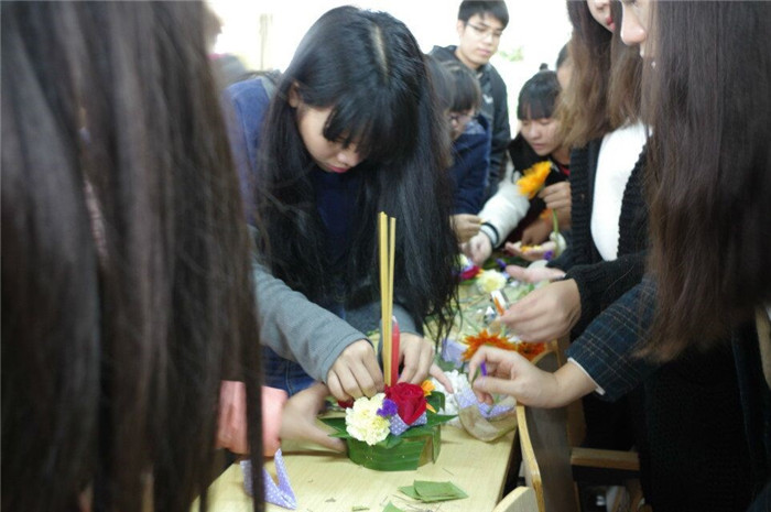 整个活动分为三部分,分别是:一、介绍泰国水灯节的来源、信仰及活动;二、泰国舞蹈表演;三、现场制作水灯及评比。在现场制作水灯环节,同学们分成十个小组,由泰国留学生带领大家亲手实践制作水灯。同学们用芭蕉干做水灯的底座,用芭蕉叶装饰,用五颜六色的鲜花点缀灯身,插上香烛,一个具有美好寓意的水灯就完成了。