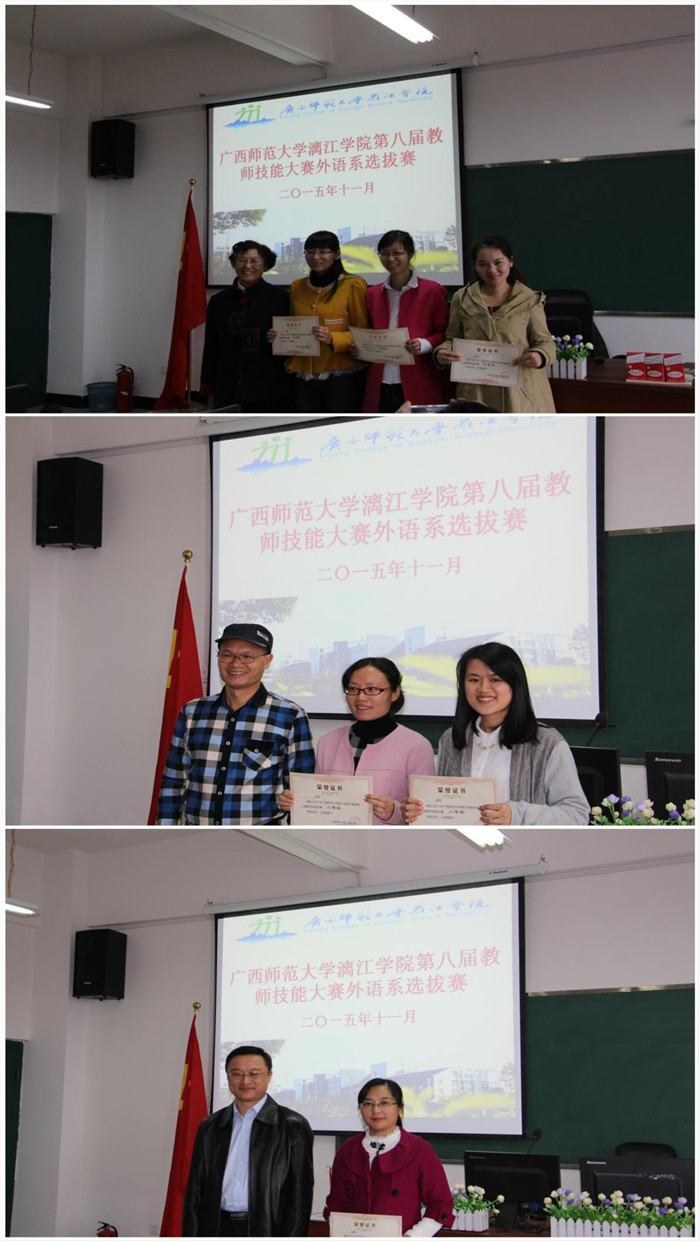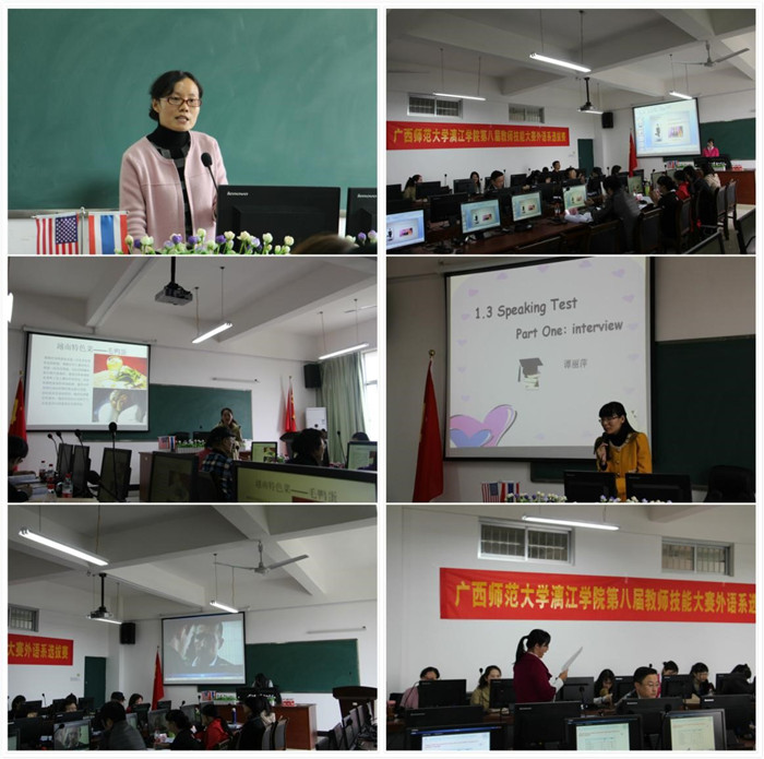 为进一步推进教育教学改革,提高教学质量,提升教师教学能力和业务水平,促进学院转型,加快应用型人才培养步伐,搭建教师教学经验交流和教学风采展示平台,外语系于11月4日下午在3411同声传译室举行漓江学院第八届教师技能大赛系内选拔赛,此次外语系共6名教师参加了比赛,外语系系领导班子、各教研室教师代表及学生代表均到场观摩学习。作为本次比赛的亮点,除系内评委团外,外语系还专门邀请了桂林市任远中学杨少明校长、科研处主任朱秋萍老师、教研处主任粟月老师以及来自十六中的桂林市英语学科带头人覃桂银老师等专家,前来指导并担任评委嘉宾,本次大赛系副主任肖立章老师由主持。