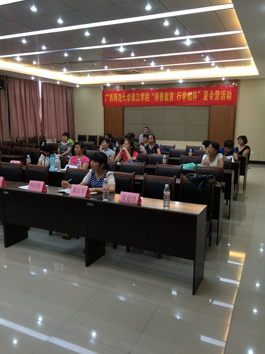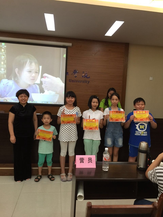上午9点,所有营员在3301会议室举行开营仪式,指导老师张超锋和外教Julius分别致开营词。9:30分夏令营活动正式开始,外教Julius和 Gina在2408教室对所有的营员进行口语培训以及开展丰富多彩的游戏活动。陪同的家长则参观了创业基地,随后国家二级心理韦玉敏老师开展了“父母如何与孩子沟通”的讲座,家长纷纷表示收获满满。 11点30分,营员们在工作人员的安排下,井然有序地在食堂三楼进餐。午餐休息后,工作人员对营员们的站姿进行的训练,随后代领小朋友们在艺术设计系教学楼进行了古筝欣赏,学习画画,以及手工DIY等。与此同时家长在3301欣赏“博爱”演讲视频,许多家长引起了共鸣,对如何教育孩子也有了更加深刻的认识。 在结营仪式上,营员们发表感言,汇报一天活动的收获并进行了舞蹈、唱歌等才艺表演。最后外语系系主任何玲老师做了结束致词。这次活动让营员们学习了许多新的知识,也让他们懂得如何表达对父母的爱,让家长们学会如何与孩子更好地沟通和相处,也让择善教育团队学到如何全面的考虑问题以及团队协作的能力。