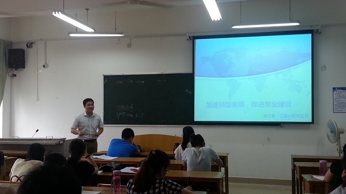 会议的第四个环节是系副主任肖立章老师做题为“加速转型发展,推进专业建设”的发言,根据国家和学院的要求,深化高校教育改革是当前和今后一个时期推进高等教育综合改革的重要内容,加速转型发展,推进专业建设主要是要落实和认真抓好六项重点任务:一是改革、创新人才培养模式,要以修订应用型人才培养方案为抓手,坚持立德树人基本导向,开展创新型人才培养观念大讨论,解放思想、破除偏见,完善改革课程体系。二是加大校企合作的宽度与深度,积极推进协同育人机制,要确立社会需求为导向的人才培养机制,推进高校与高校,高校与政府、社会的协同发展,推进学科专业间的交叉融合。三是强化创新创业实践环节,要加强实践教学资源建设和共享,积极搭建专业实习实训平台,鼓励师生参与创新创业实践。四是创新传统考核方式,随着教学内容和课程体系的更新,以闭卷笔试为主的传统考核方式已难以适应应用型人才培养的需要,建立一套符合应用技术型人才培养要求和专业特点的考核大纲,有利于培养具有应用能力、实践能力、创新能力的应用技术型人才。外语系积极鼓励老师对所教授课程进行创新考核,着眼于科学全面地评价学生的综合素质,强化知识应用能力、实践能力和创新能力的考核,把“注重考核学生实际能力”、“全面考核”、“过程考核”等理念贯彻到课程考核改革中,充分发挥考核促进教法和学法改进的作用。五是提升教师自身专业发展。要坚持全员参加、外出培训与自我提升相结合的方式,快速高效的打造一支名副其实的“双师型”教师队伍,深入改革教学内容和方式方法。