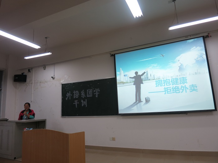 为了响应全院开展的禁止泡沫餐盒进入校园的活动,外语系于11月25日晚八点在1506教室举行了第二次“拒绝外卖 拥抱健康”的宣传会议。会议由周俊巧老师主持,外语系团学干部及全体2014级学生参加会议。