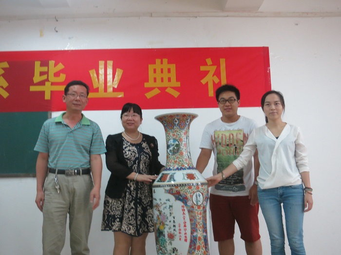 毕业典礼最后, 毕业生们向外语系赠送一古典瓷瓶作为感恩母校的礼物,并进行合影留念。