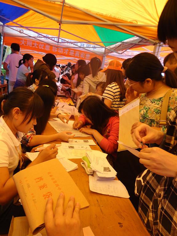 迎新注册处虽然都是忙碌的志愿者和学生干部,但是志愿者们却没有因为人多而导致工作分配混乱:有些同学一直站在饮水机旁,只要有新生来注册,他们就会立即给家长端水;有些同学始终拿着外语系的标志牌,只要有大巴停靠,他们就会在第一时间上去引导新生;有些同学则从未离开帐篷口,只要有新生拿着行李进来时,他们都要帮助新生进行行李登记和分类……