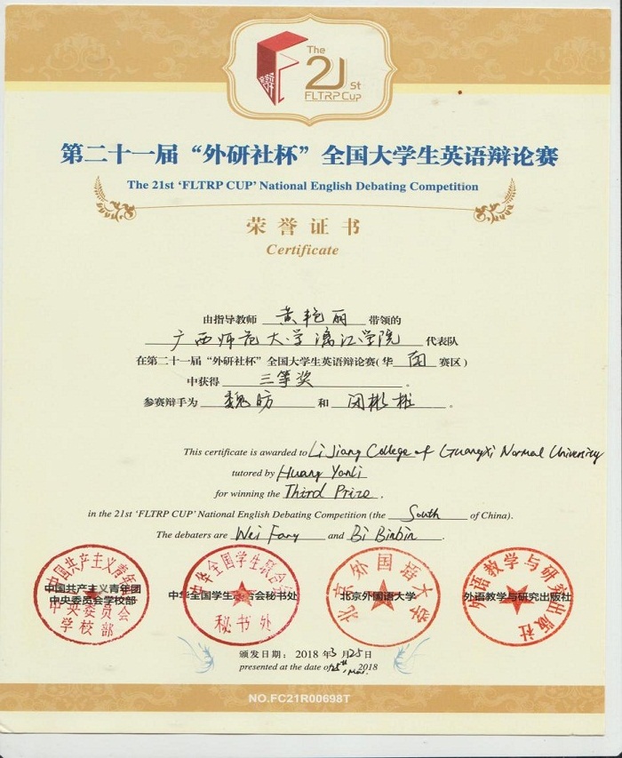 级商英专业魏昉、闭彬彬两位同学代表我校参赛,最终荣获华南赛区三等奖。我校英语演讲辩论队指导老师黄艳丽老师带队参赛。