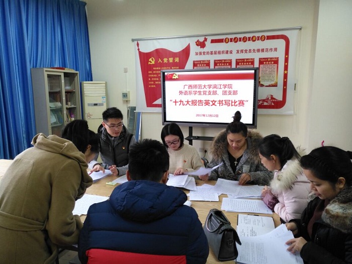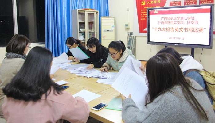 为了更好地弘扬党的十九大精神,同时进一步提高我系学生学习英语的兴趣,营造良好的英语学习氛围,广西师范大学漓江学院外语系学生党支部联合团总支学生会开展“党建带团建”活动,在外语系党总支葛巍书记、林凤凤副书记和指导老师赵莉莉同志的带领下,于2017年12月4日至20日组织开展了党的十九大报告英文书法比赛。