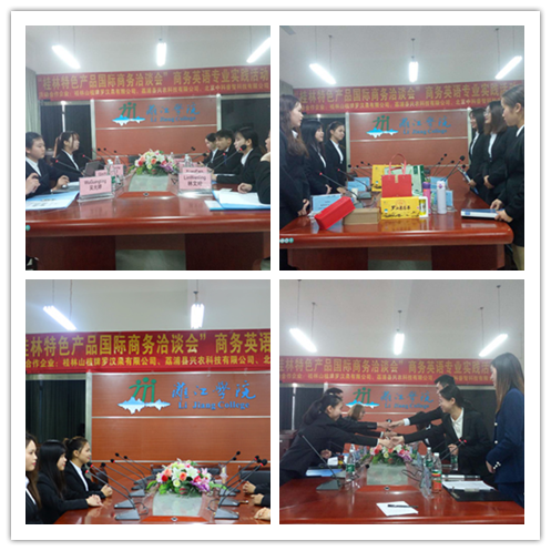 接着,5-6人一个小组共同完成整个进出口贸易流程的商务洽谈,每个小组选择一个桂林特色产品来进行洽谈实践,全程使用英文进行交流,每一个学生都必须有发言的机会。所有学生必须穿着正装,提升专业形象。