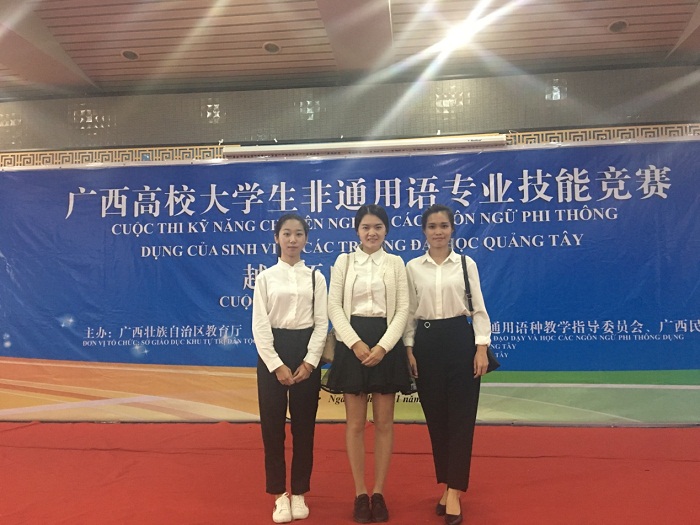 近日,由广西教育厅广西高校非通用语种教学指导委员会主办,广西民族大学承办的首届“广西高校大学生泰语、越南语口译比赛”在广西民族大学举行。来自广西民族大学、广西大学、广西外国语学院、广西师范学院及我校等区内八所高校的27名选手参加比赛,同台竞技。我校外语系2014级泰语专业施肖兰、梁栩娴,2014级越南语专业的李雯超、黄金霞共四名同学代表我校参赛。泰语教研室的陈双飞、越南语教研室的阳琦兰两位老师应邀担任本次的比赛的评委。