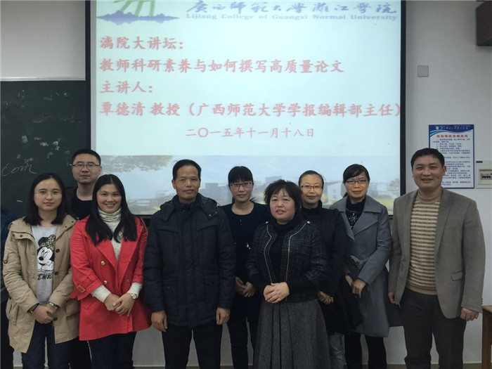11月19日下午,广西师范大学学报编辑部主任覃德清教授应邀做客外语系,为师生们作了一场题为“教师的科研素养与论文写作”的讲座。外语系全体教职员工及理学系部分教师参加了讲座。