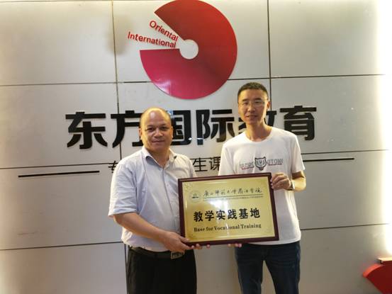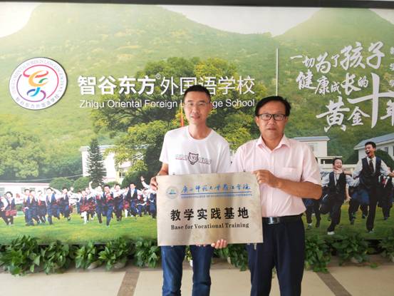 为进一步落实学校应用型人才培养计划,推进学科专业建设,加强校外见习、实习、就业基地建设,经过前期的洽谈,近日,外语系张超锋副主任和英语教师教育教研室的欧炼芬老师代表我院前往桂林市东方国际教育和桂林智谷东方外国语学校进行实习基地的挂牌仪式。