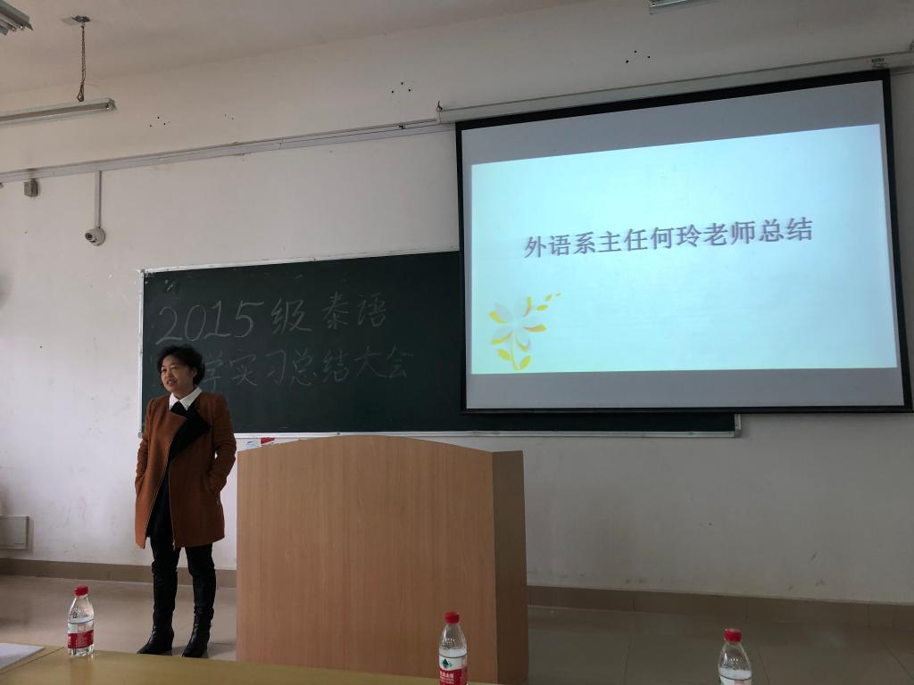 大会尹始,主持人代表全班同学感谢学校为泰语专业量身定制的“3+1”人才培养方案,让我们有了出国外留学的机会。接着,各学生代表以PPT的形式,从学习、生活、旅游和实习四方面全面总结了在泰国为期十个月的留学生涯,分享了其间的体会、感受和收获。最后,外语系主任何玲老师对本次大会进行总结发言,何主任对大家学成来表示祝贺,为大家学会成长、懂得感恩感到十分欣慰,希望大家在今后的学习生活中不断进步,争取更上一层楼。