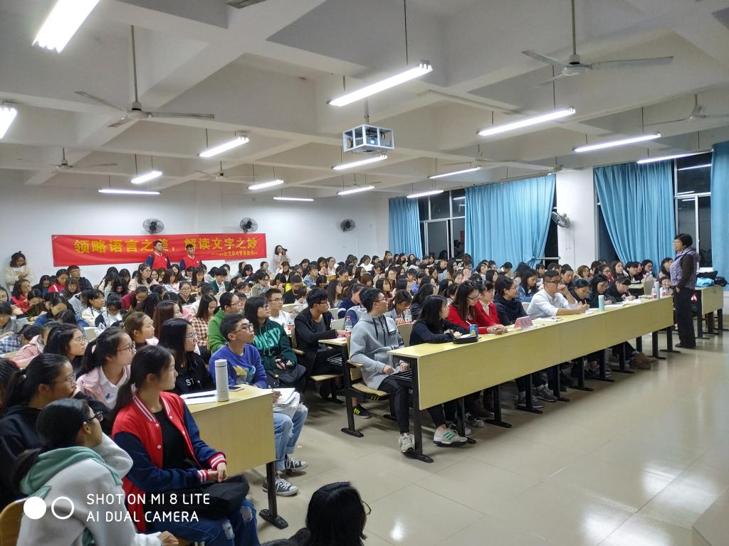 10月24日晚上7:00-9:30,一场由外语系语言文化教研室推出的题为《让青春与文学作伴》的讲座在我校1307教室火爆举行,该讲座是外语系外语文化节的一个子项目。来自广西师范大学外国语学院的陆巧玲教授别开生面、热情洋溢地引领外语系师生们探讨了青春和梦想,领略文学和语言的隽美。