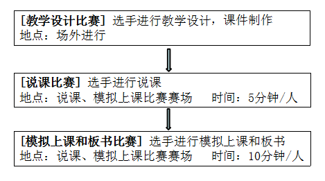 比赛进行教学设计、说课、模拟上课和板书三个项目比赛,每位参赛选手均要参加上述三个项目的比赛,个人成绩为三项比赛项目成绩的总和。