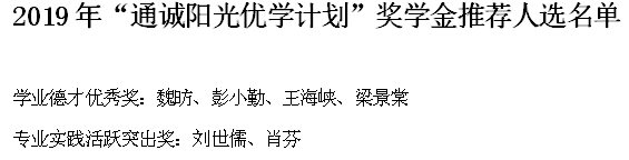 根据《关于做好2019年“通诚阳光优学计划”奖学金评审工作的通知》要求,经个人申请,班级初评,魏昉等四名同学符合2019年“通诚阳光优学计划”奖学金专业学业德才优秀奖申请条件,刘世儒等两名同学符合专业实践活跃突出奖申请条件,现予以公示,名单见附件。