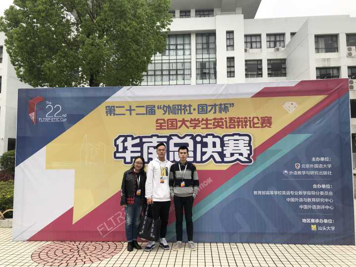 2019年4月13日至14日,第二十二届“外研社·国材杯”全国大学生英语辩论赛华南赛区决赛在广东汕头大学隆重举行。我校选派魏昉、莫禹桐两位同学参赛,经过六场辩论比赛,最终荣获三等奖,其华南赛区积分排名比去年前进了十五个名次,成绩有所突破,获得我校参加此项赛事以来最佳成绩。我校英语演讲辩论队指导老师黄艳丽老师带队参加了本次比赛,并且获邀担任比赛评委。