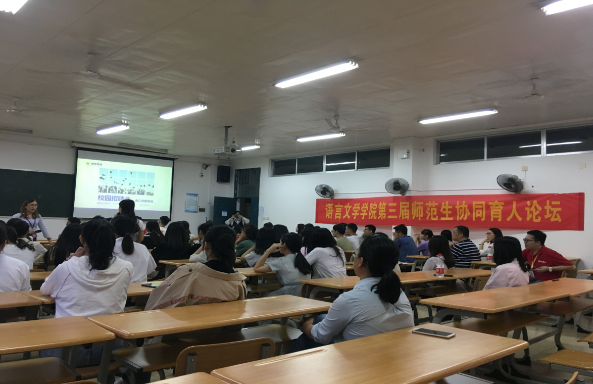 2019年5月22日晚19时,语言文学学院第三届师范生教育协同育人论坛(柳州博学教育集团专场)在1409教室隆重举行。来自柳州市最大的教育培训机构柳州博学教育集团和桂林市发展最快的点睛教育机构一行11人参加此次论坛,论坛由语言文学学院院长何玲教授主持。语言文学学院汉语文学专业70余名学生和英语专业30多名确实出席此次论坛。此次论坛是博学教育及其合伙人点睛教育在漓江学院的第二次宣讲和选聘实习生。