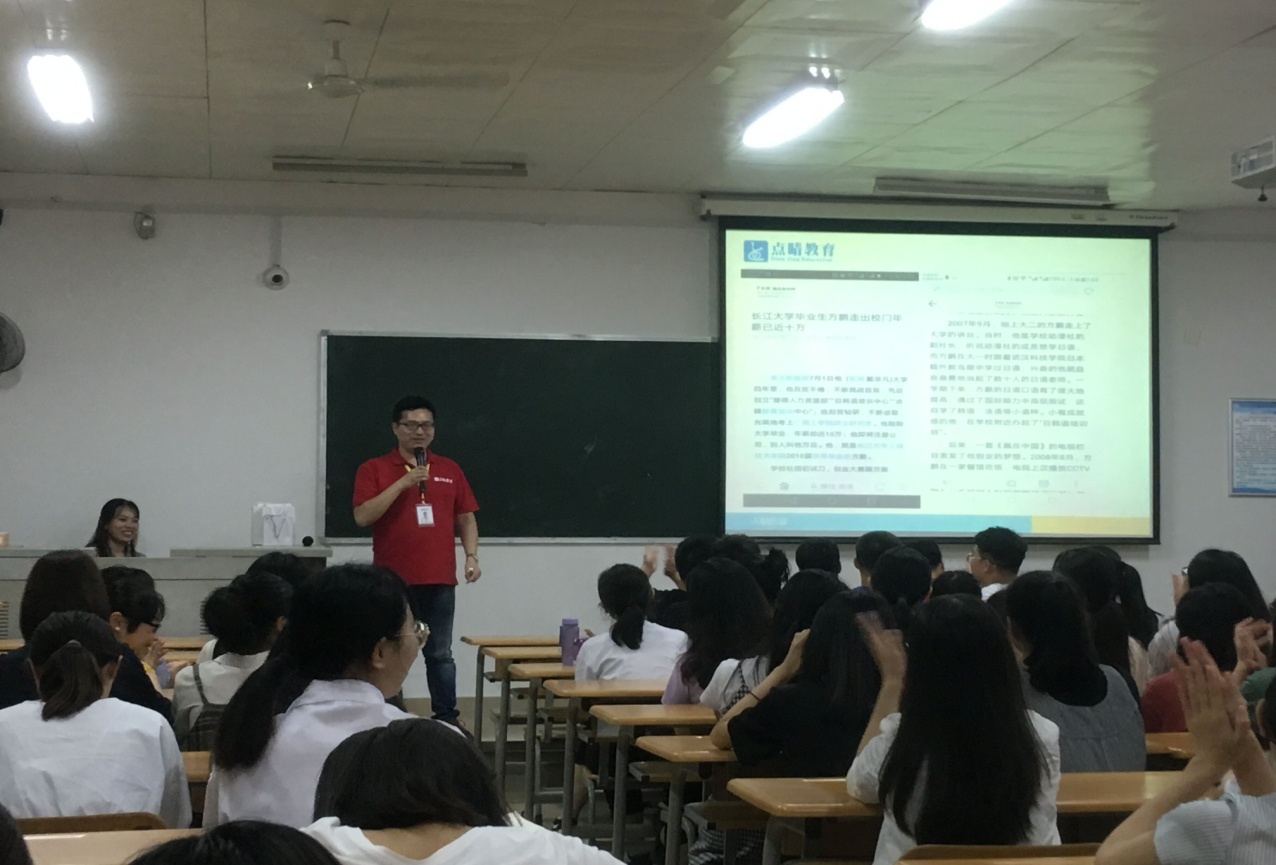 论坛从博学教育集团宣传片中开始,接着集团负责人介绍集团的基本情况,工作环境,工作及晋升制度,薪资待遇,等等。随后,点睛教育负责人从职业理想,行业选择,结合自己的创业经验切入进行宣讲,同时也就工作及晋升制度,薪资待遇等进行了说明。两家机构宣讲结束后,与同学们进行近距离交流与答疑,欢迎汉语言文学专业和英语专业毕业生到博学教育集团和点睛教育实习和就业。