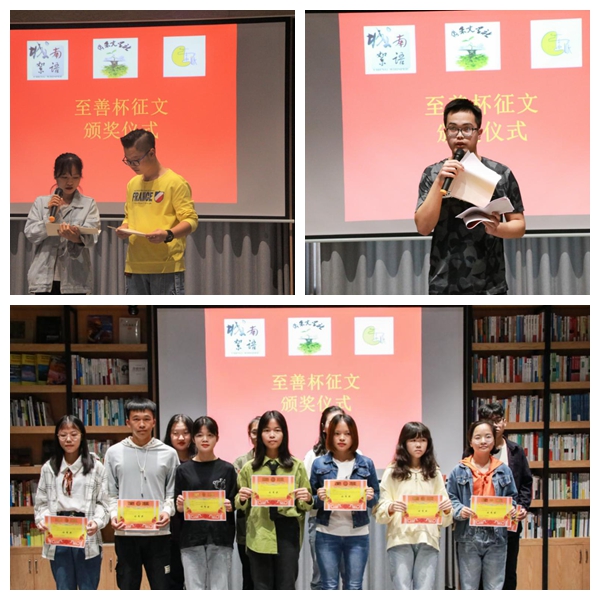 为贯彻落实习近平总书记在党的十九大报告中提出的“提升文化自信,建设文化强国”的战略方针,并通过征文隆重纪念中华人民共和国成立70周年。广西师范大学漓江学院桂月诗派,因果文学社,城南絮语工作室联合举办了“至善杯”征文比赛。于2019年10月15日下午,在独秀书房举行第一届“至善杯”征文比赛暨2019年首届广西大学生创意写作大赛颁奖仪式。