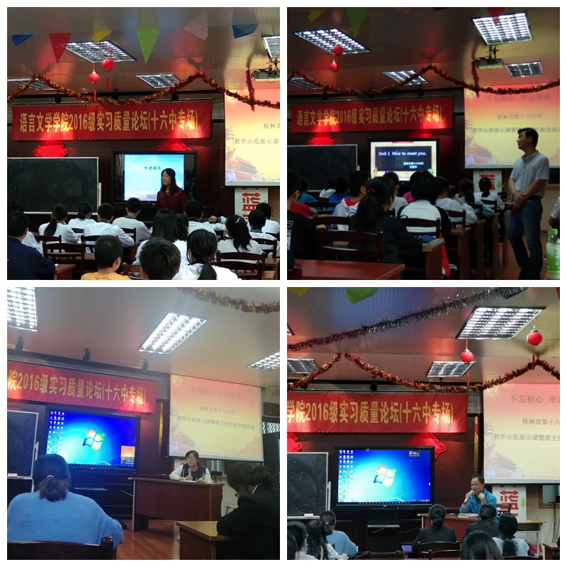 10月16日下午两点,我院院长何玲、副院长陈锴与语言文学学院唐让操、曾强等9位老师等来到桂林市第十六中学,与十六中领导、老师共同召开实习质量论坛。语言文学学院的27名实习生也参与了论坛。