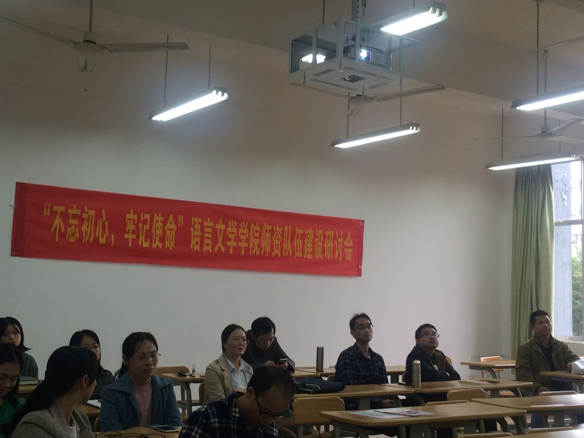 11月13日下午两点,我院在至善楼2205室举行“不忘初心、牢记使命”师资队伍建设研讨会。会议由何玲院长主持,教科处副处长肖立章、语言文学学院副院长张超锋、陈锴,汉语言文学及汉语国际专业全体专任老师参会。