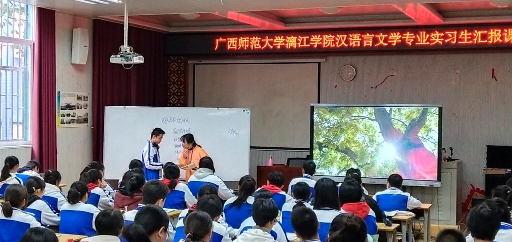 为了更好的了解广西师范大学漓江学院学生在桂林八中的实习情况,加强对实习生的管理,切实提高学生的实习质量,根据学院实习工作安排,我院江仿书记、语文教学法陈霞老师、实习带队刘渊老师及50余名大三学生于2019年11月20日下午前往桂林市第八中学开展同课异构活动。