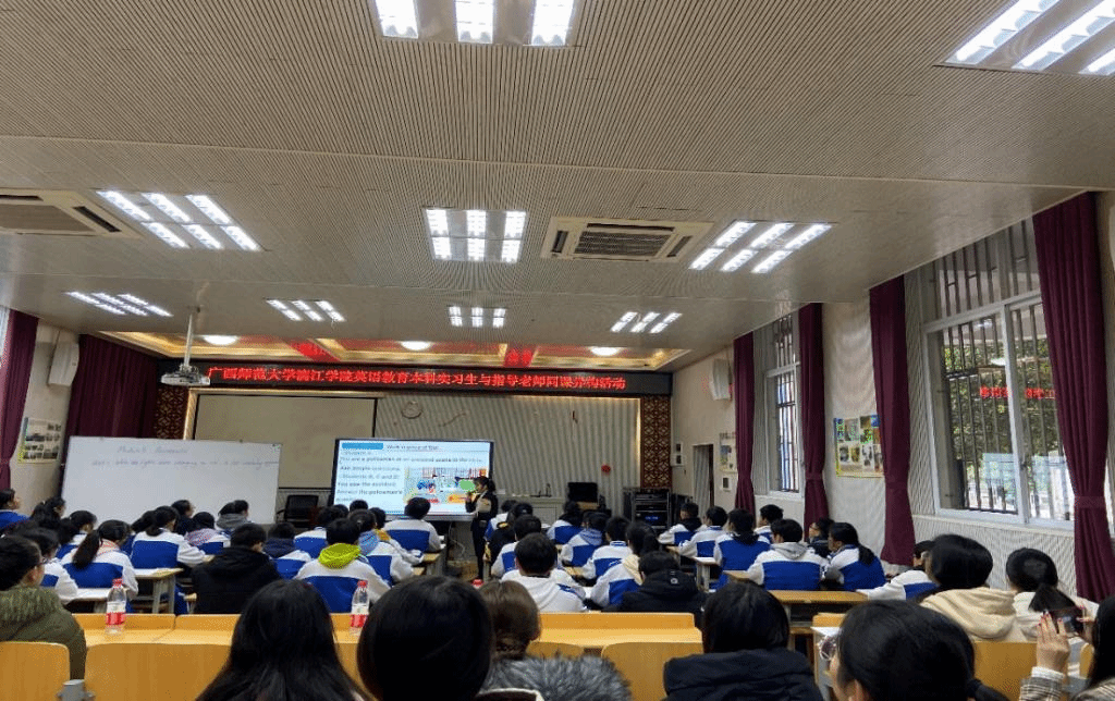 此次活动由桂林市八中龚静颖老师和我校2016级英语专业纪晓菲同学进行授课,桂林八中的51名学生应邀作为授课对象,龚老师和纪晓菲同学分别展现了专业老师和职前师范生对课堂的掌控及设计能力。2017级的同学也前来参与此次活动并交流学习。课后龚老师和纪晓菲同学分别对本节课的上课思路进行了一个简短发言。参与此次活动的林乐平老师和罗桂温老师分别对她们进行点评。