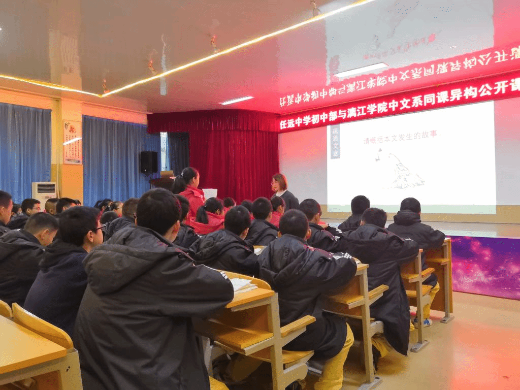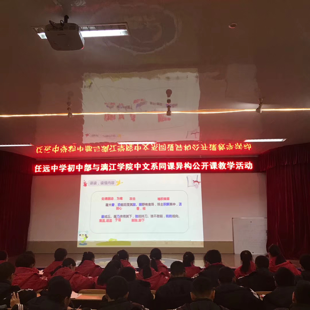 2019年11月27日上午,伴随着清晨雾雨蒙蒙,语言文学学院汉语言文学一班(2)组35名学生在潘冠海教授与熊焕颖老师的带领下,前往桂林市任远中学初中部进行“任远中学初中部与漓江学院中文系同课异构公开课教学活动”见习听课,活动地点位于桂林市任远中学初中部一楼报告厅,本次活动主讲人是语言文学学院2016级汉语言文学专业的一名在校实习学姐和一名在校老师的讲课。