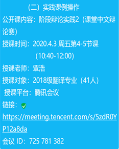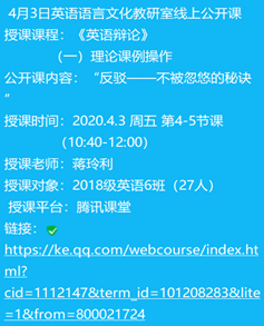 四、线上公开课。4月3日上午,本教研室推出了《英语辩论》理论课例操作和实践课例操作两门公开课。