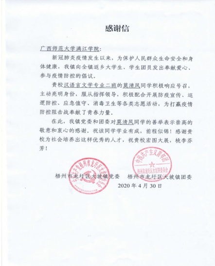 莫清凤是语言文学学院2016级汉语言二班的一名同学,新春之际,新冠疫情防疫工作已经开展到各个地方,为更好开展此工作,该同学积极主动投入到家乡的抗疫支援工作中,全力配合开展防疫宣传、巡逻防控、应急值守、消毒卫生等各类志愿活动,这一封来自梧州市龙圩区大坡镇党委和团委的感谢信不仅是对她工作的认可,也是对她不畏困难,坚持初心的赞许。