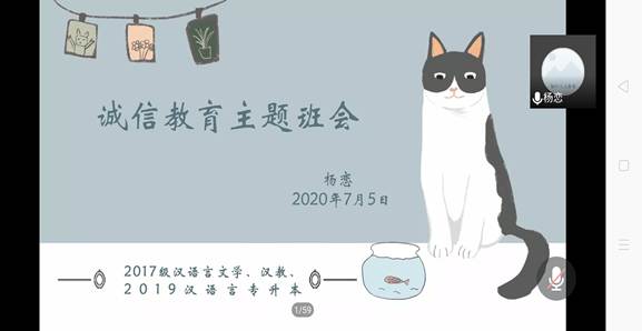 2017级汉语国际教育专业、2017级汉语言专业5、6班、2019级汉语言文学专升本共232名同学于7月5日晚7:30在腾讯会议召开“诚信教育”主题班会,会议由辅导员杨恋主持。