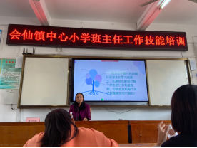 2020年11月11日星期三下午三点,桂林市会仙镇中心小学秦秀珍老师在大阶梯会议室为10名17级实习生和学校里各班班主任进行了班主任工作技能讲座培训。