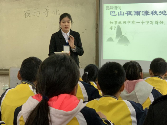 当天上午,首先由初一年级的语文老师盘卿娉老师为该校201班的同学们讲述李商隐绝句《夜雨寄北》。盘老师首先向同学们介绍了李商隐的生平,然后带领同学们有感情地朗读诗歌,并带领大家深入细致地对《夜雨寄北》进行赏析。在教学过程中,盘老师通过逐句讲解、视频播放、组织背诵等教学形式由浅入深地对诗歌进行讲解,充分让大家领会这首诗歌带给我们的深情感受,让孩子们幼小的心灵接受古典诗歌的熏陶。