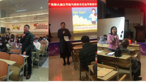 课后,活动参与人员进行评课研讨,研讨会有带队老师陆海峡老师主持,曾老师和实习生廖兰承对各自的授课做自我评价,随后参与听课活动的老师、实习生和2018级见习生对两位老师的课进行了评价和讨论。我院副院长张老师、罗老师和任远中学曾校长分别对两位老师的授课进行了针对性的点评,并提出了很多建设性建议。