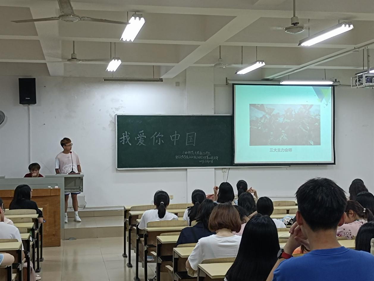 此次主题教育班会由韦荣炮、张桂翠及郭苑杏三位同学代表领学。首先,带领同学们回顾长征发生的时间及原因,重温红军长征的光荣岁月,并阐述了长征伟大胜利的历史意义。随后,系统地讲述了长征精神的内涵。风风雨雨的长征已经过去70多年,但艰苦奋斗、顽强拼搏的长征精神依然存在并流传。其次,领学通过“H&M事件”等,讲解什么是国家集体意识、民族团结意识的涵义、如何践行爱国精神等。重点强调我们每一位公民都应从大局、全局的高度来充分认识维护社会稳定的重大战略意义,增强维护社会稳定的政治责任感。