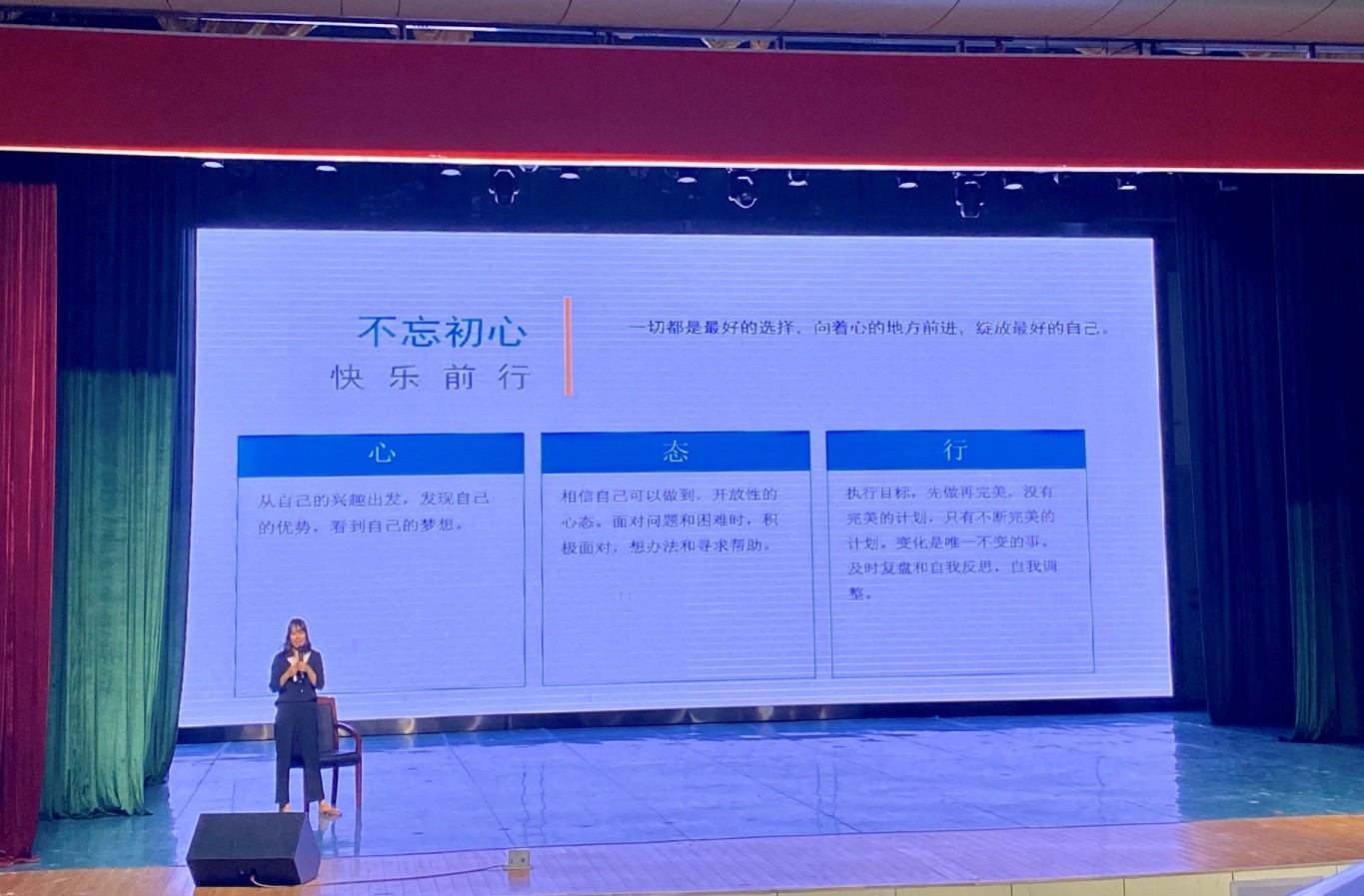 本次讲座,主讲人从自身成长经历、自我定位、制定行动计划和沟通技能等四个板块为同学们进行讲解。她在分享中表示:希望同学们向着心的地方前进,从兴趣出发,发现优势,积极面对各种困难,然后再去实践,才能绽放出最好的自己。随后,她引用SMART原则,从可衡量、可实现、相关性和时限性四个方面进行讲解,通过自身的经验为同学们详细讲述了如何高效地学习、规划短期目标以及运动的必要性,为2021级的同学们提供了宝贵的经验,使其更好的融入大学生活。最后,对2021级同学们寄予期望,希望2021级的新生们心怀梦想,踏踏实实的走好接下来的每一步。