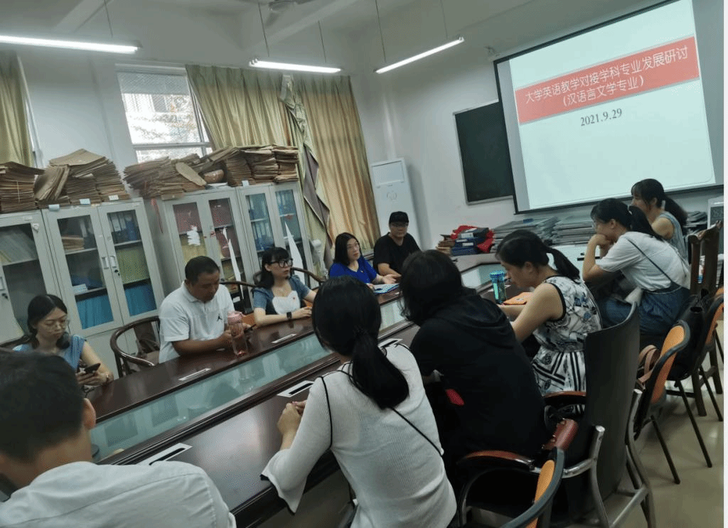 2021年9月29日上午,大学英语第一教研室在会议室2108进行了“大学英语教学对接专业发展研讨系列”的第一次教学研讨——“大学外语教学对接学科专业发展研讨(汉语言文学专业)。”此次研讨会由教研室主任黄文敏老师主持,语言文学学院副院长陈锴老师,现当代文学教研室主任周婕老师(在线),汉语言汉语文学专业辅导员邓克鹏老师,语言文学学院行政秘书林玲老师(在线),以及大学英语第一教研室全体老师参加了此次研讨。