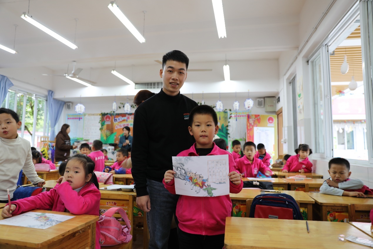 图:杨杰夫老师带领小朋友学习正确的书写姿势