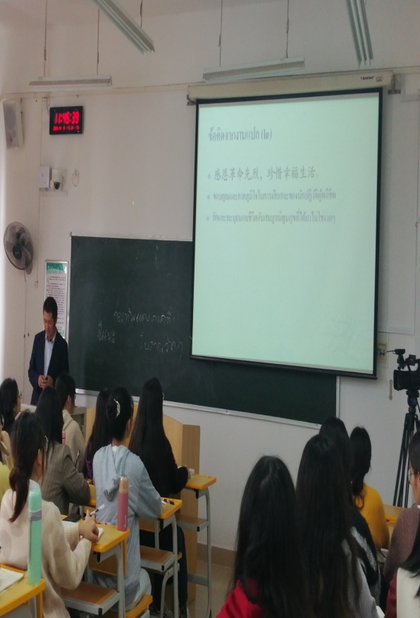 活动中,泰语专业姚垚老师以视频和文字的形式向大家展示了八路军桂林办事处的建立背景、历史和作用,并带领学生们将八路军桂林办事处相关内容进行了翻译。课上,学生们将自己所学到的翻译理论与技巧用于课堂实践翻译中,精彩的译句频频出现,课堂气氛好,育人效果佳。最后,学生们纷纷表示要感恩革命先烈,珍惜幸福生活。